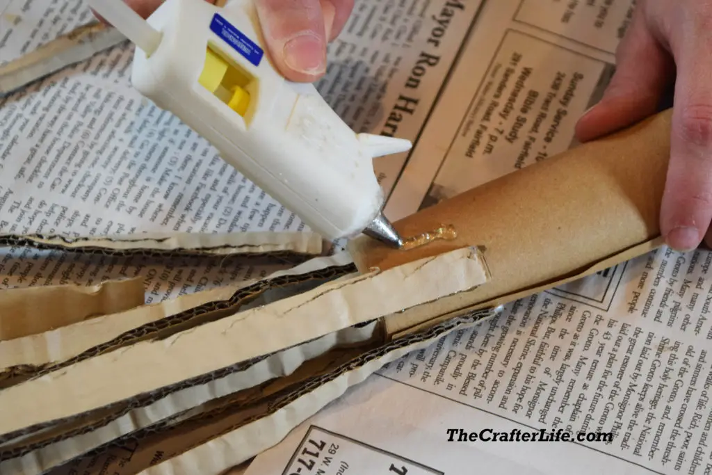 3. Stick a few strips about an inch or two inside your wrapping paper roll tube at the bottom and glue them around the inside so they are sticking out the bottom of the tube.
